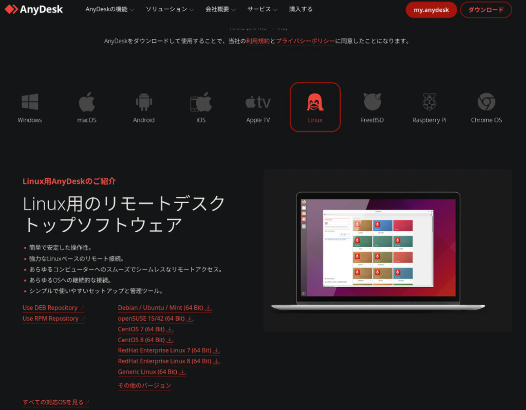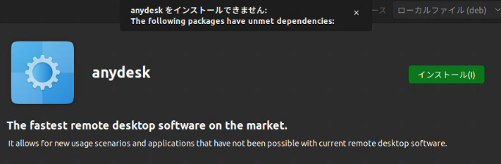AnydeskはLinux用も用意されている。サイトからdebファイルをダウンロードしインストールしようとしたが、エラー発生。