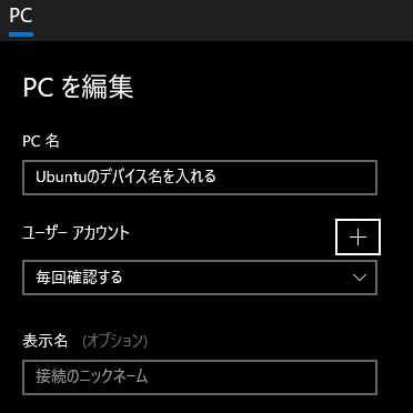 PC名にはUbuntuの画面のデバイス名を記入する。。