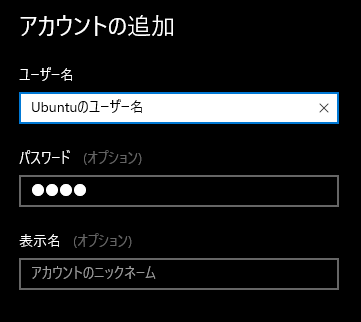 アカウントにはUbuntuのユーザ名と設定したパスワードを記入する。