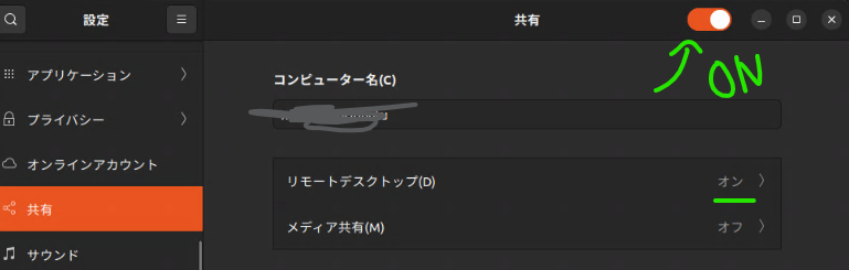 すでに設定を終えてしまっているのでオンになっているが、リモートデスクトップから設定を変更する。